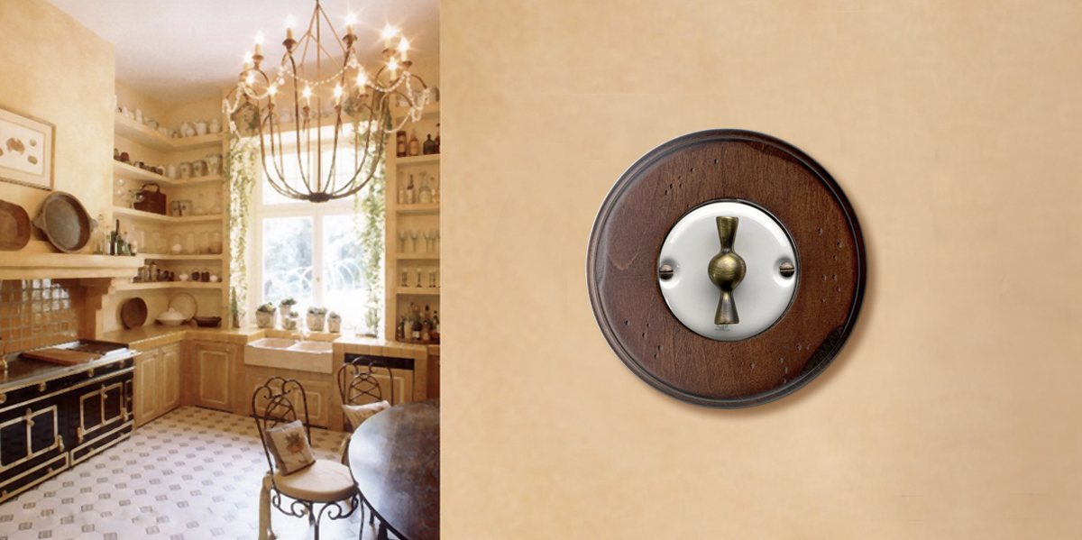 Les thermostats rotatifs avec cadre en noyer de la société italienne AVE peuvent être un joli complément aux interrupteurs rétro en noyer de Gambarelli.