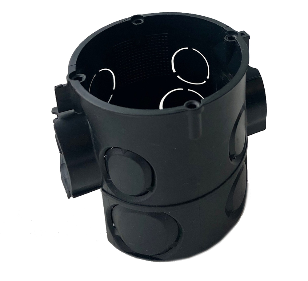Kaiser 1555-04 ronde wanddoos voor metselwerk, 2 modulen. Met uitsparingen voor kabels en buizen tot 20 mm diameter. Gegarandeerde standaard combinatieafstand van 71 mm. Voor apparaatmontage met schroeven (meegeleverd). Afstand tussen de apparaatschroeven 60 mm (standaard). Materiaal: polysyreen, moeilijk ontvlambaar, halogeen- en siliconenvrij.